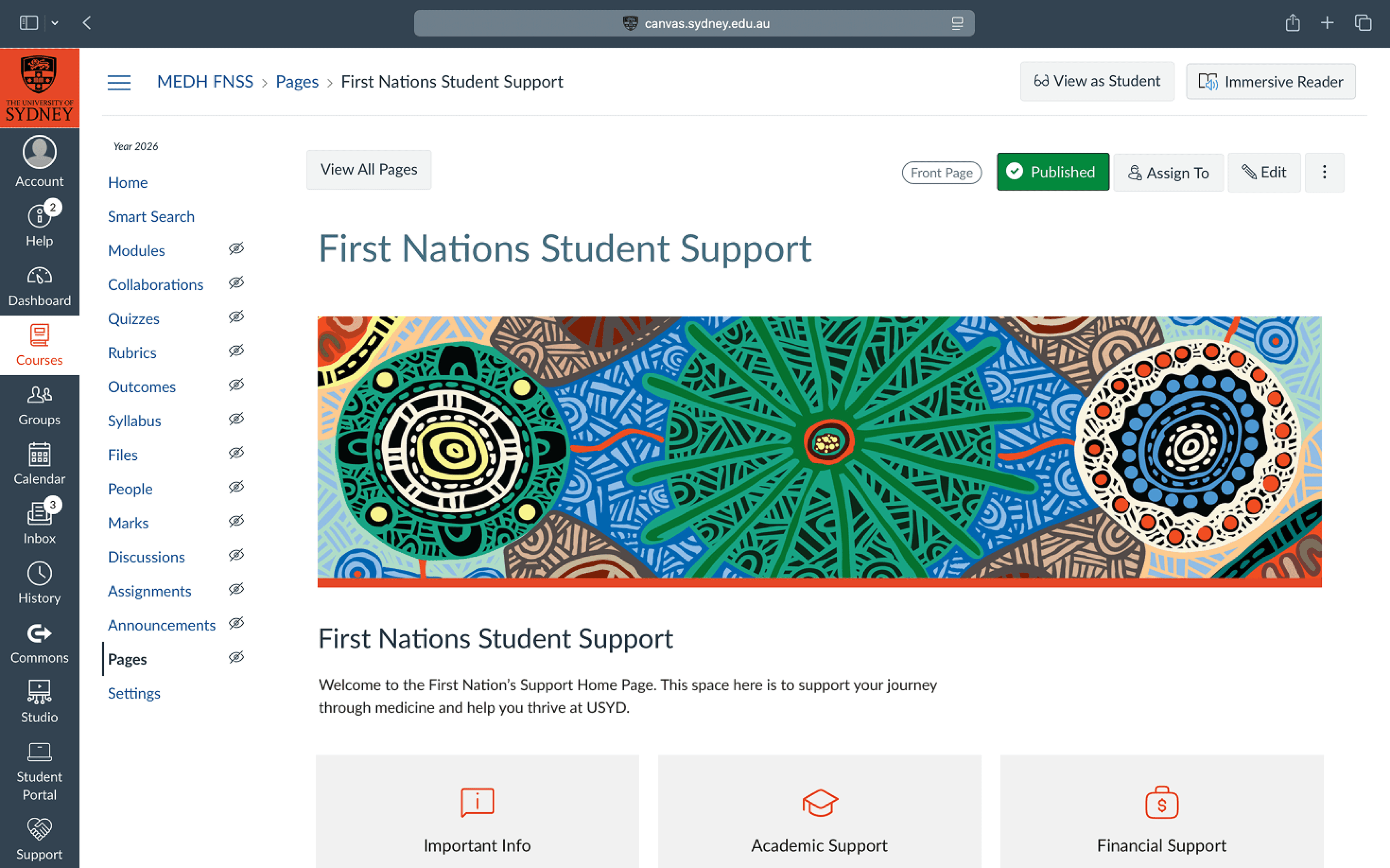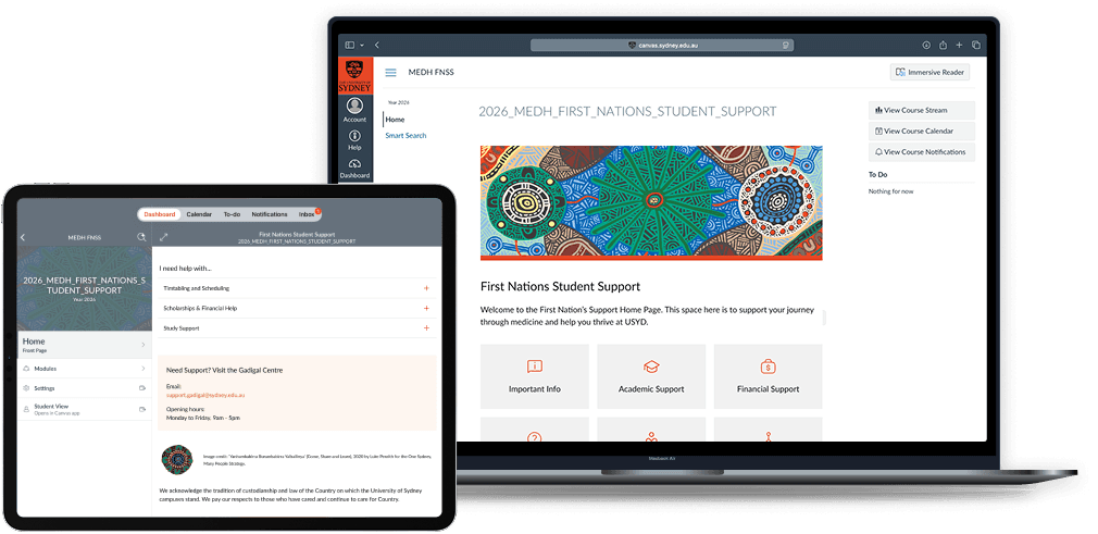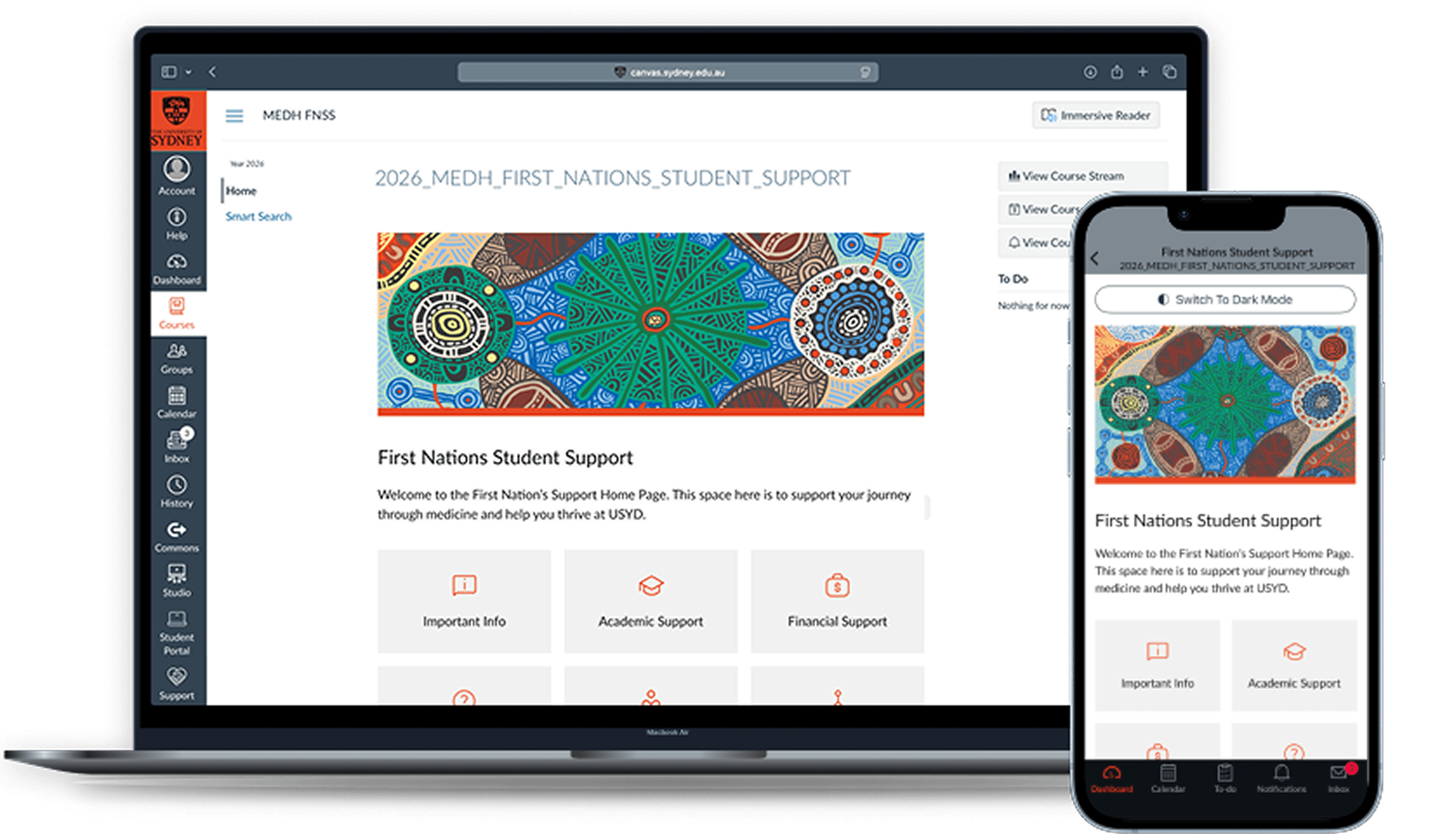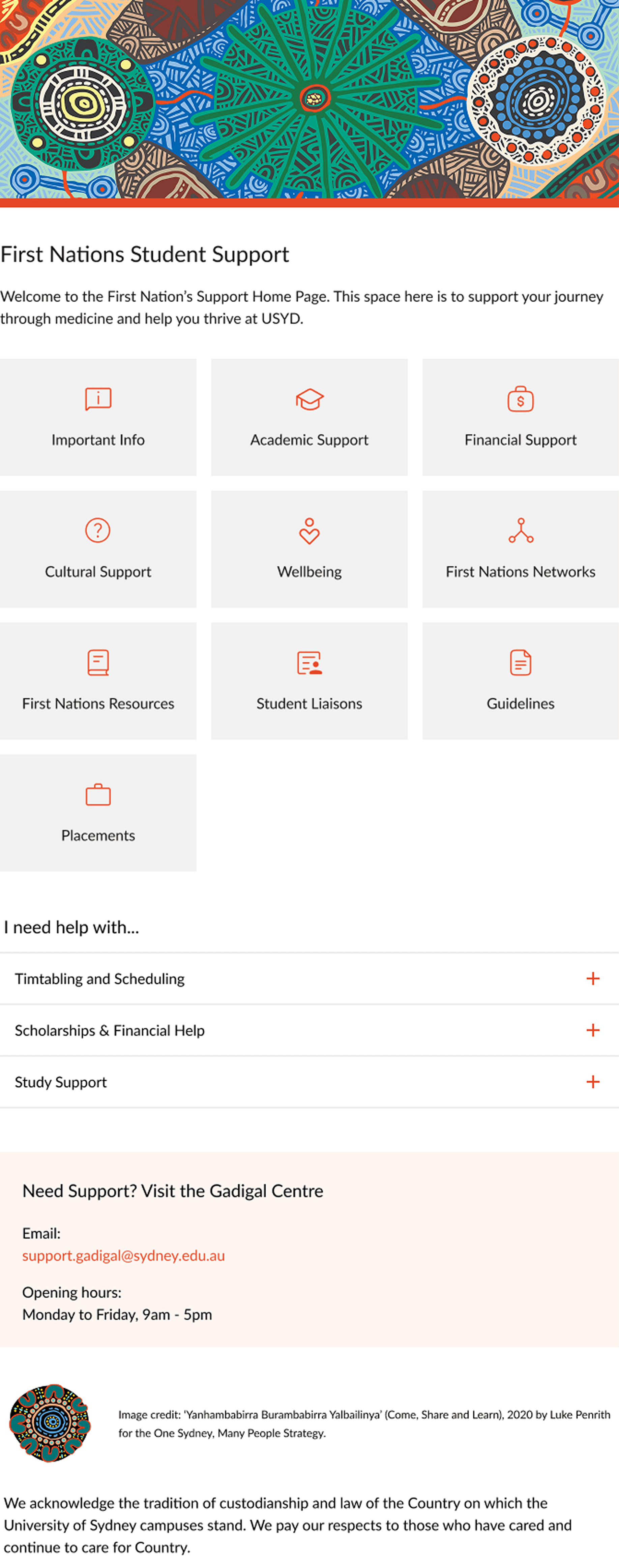 This project involved previously a conducted yarning session with First Nations students across health sciences at the University of Sydney and a resource they suggested was a tailored Canvas page that provides all information needed for their studies in addition to their face to face supports at centres and through faculty student liaison academics.