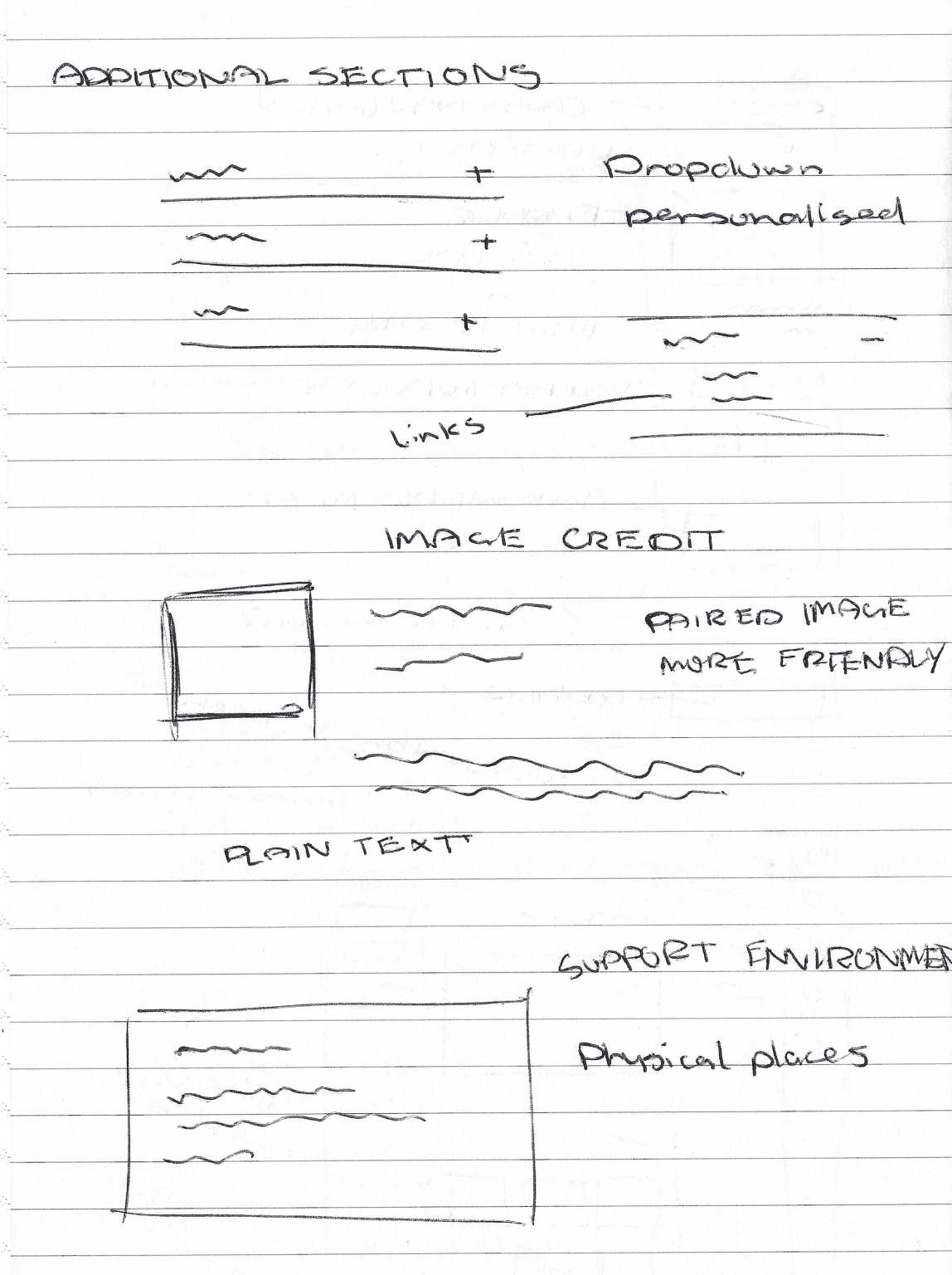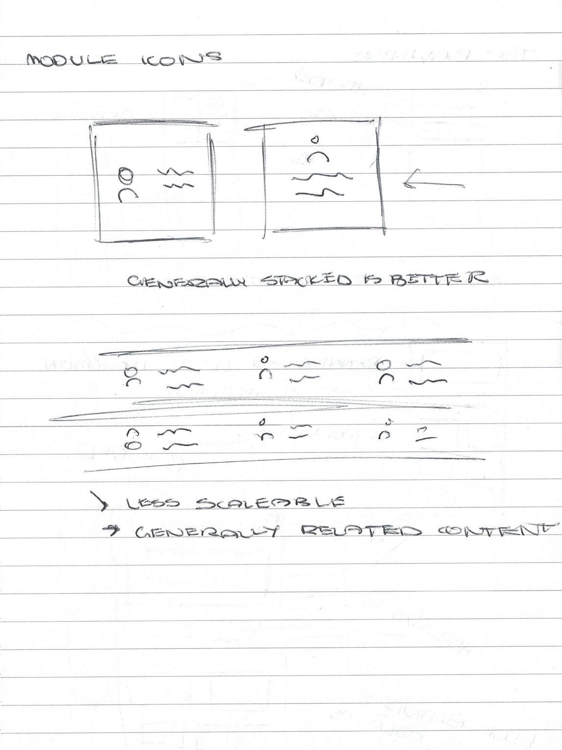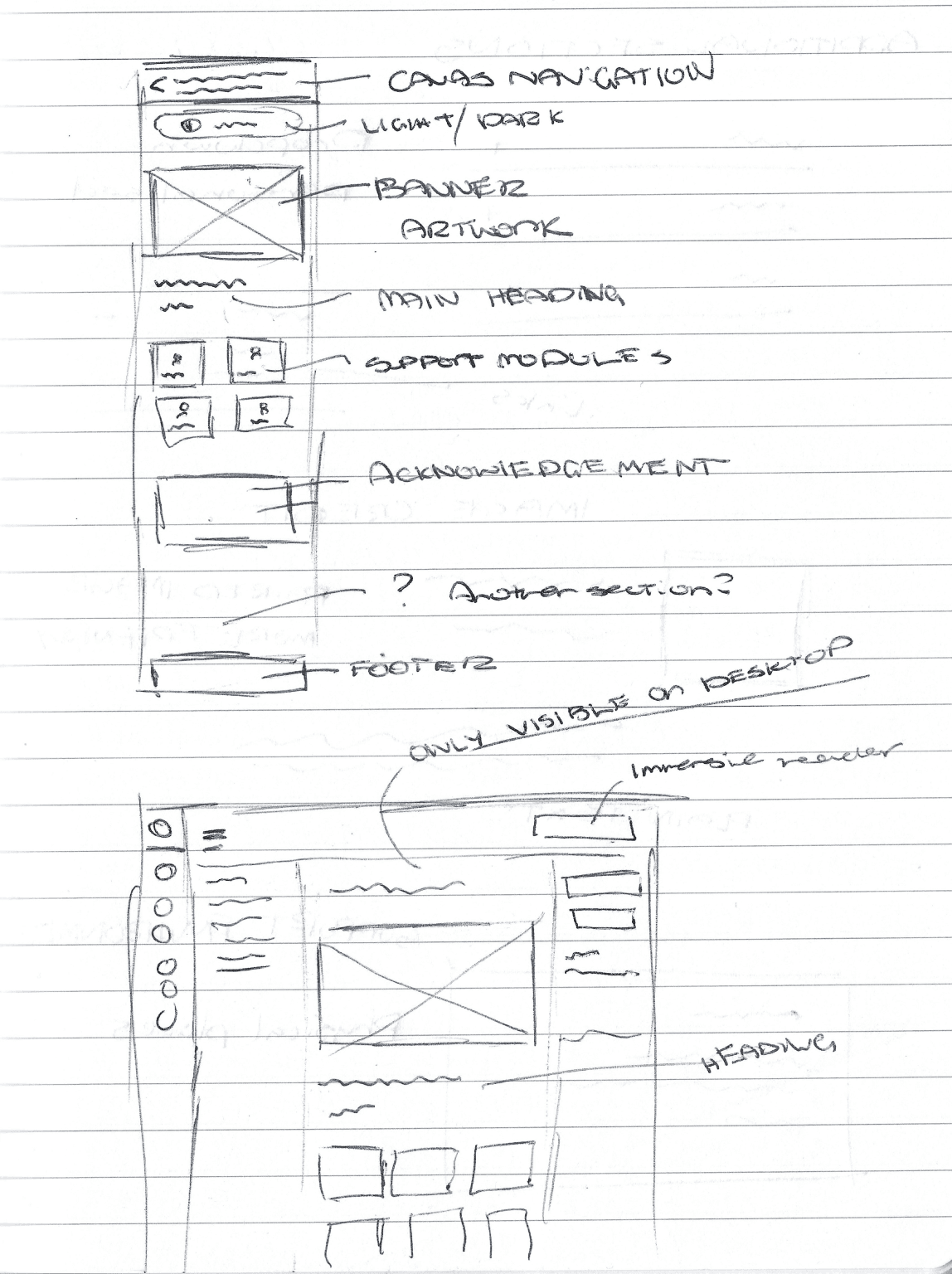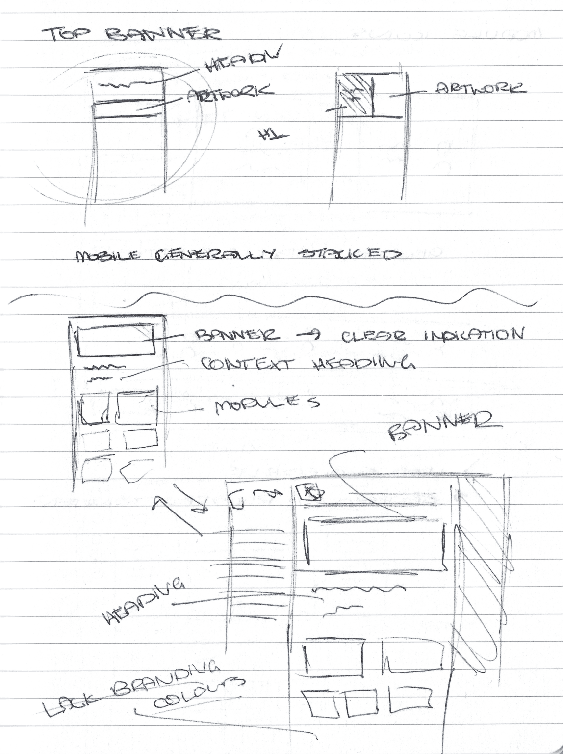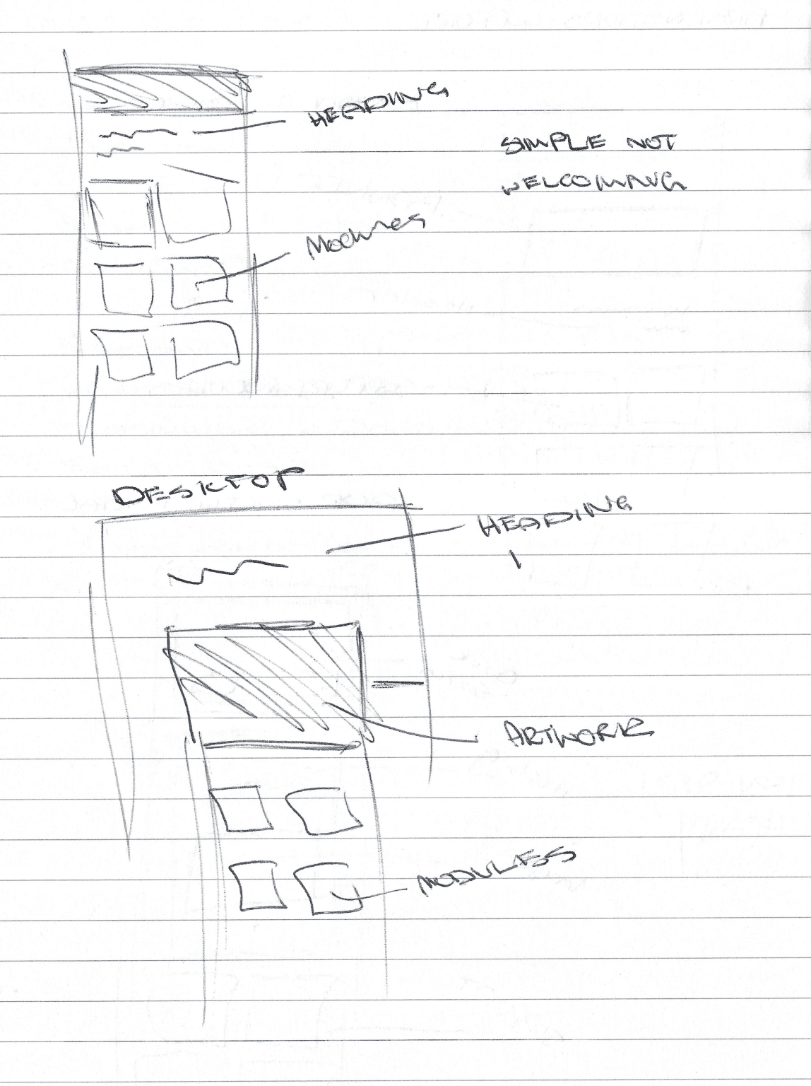 The next step involves sketching ideas and creating wireframes for rapid ideation. A visual top banner, paired with an adaptive 2/3 column grid for buttons established a solid foundation for the design. Other elements and components were also considered at this stage, with the aim of building for scalability while maintaining the visual direction and supporting previous design goals.