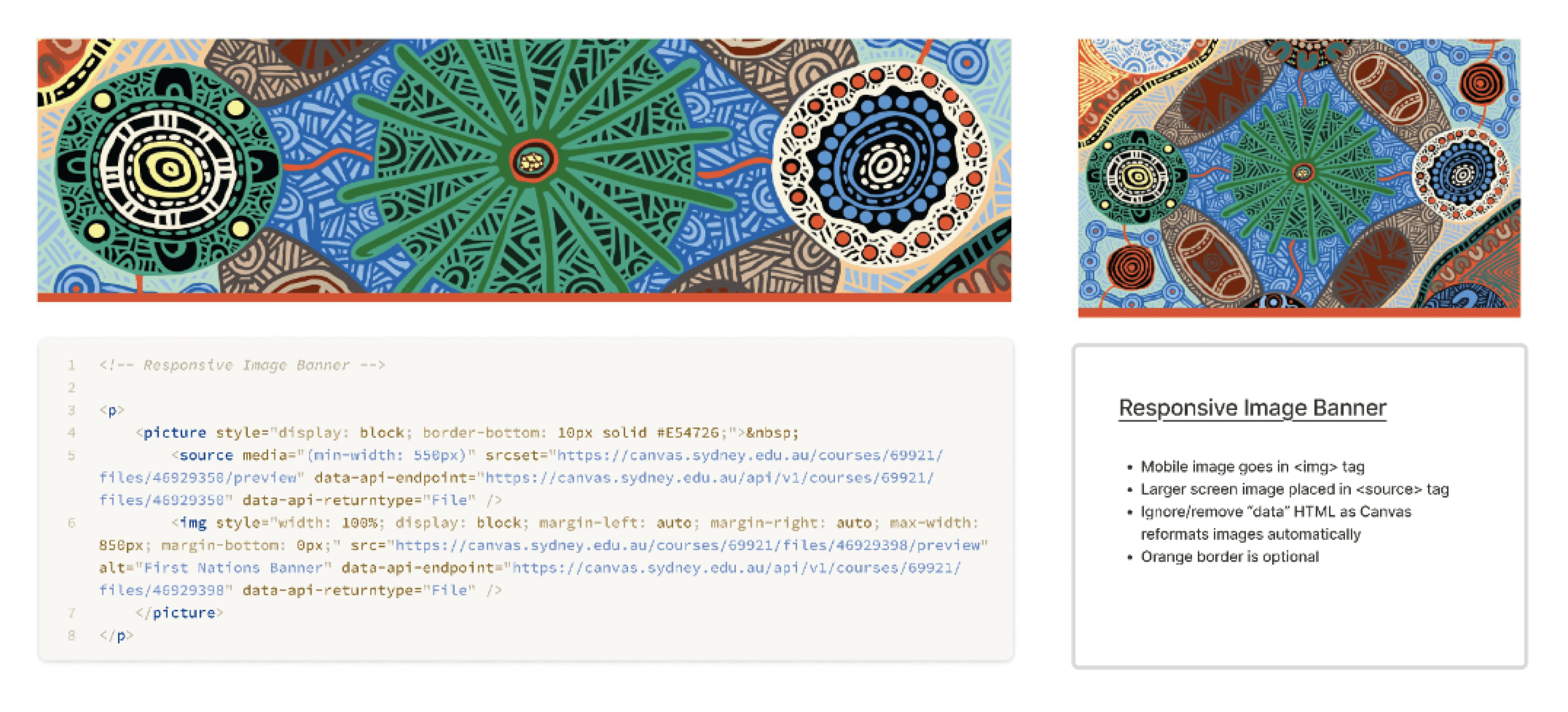 In creating the design, it follows the University of Sydney branding. It incorporates the primary USYD Ochre colour, Lato font as used in Canvas, and USYD iconography with thin strokes. Complementing these styles is a commissioned First Nations artwork, available for use to ensure cultural respect and adherence to guidelines, supporting the overall visual direction.