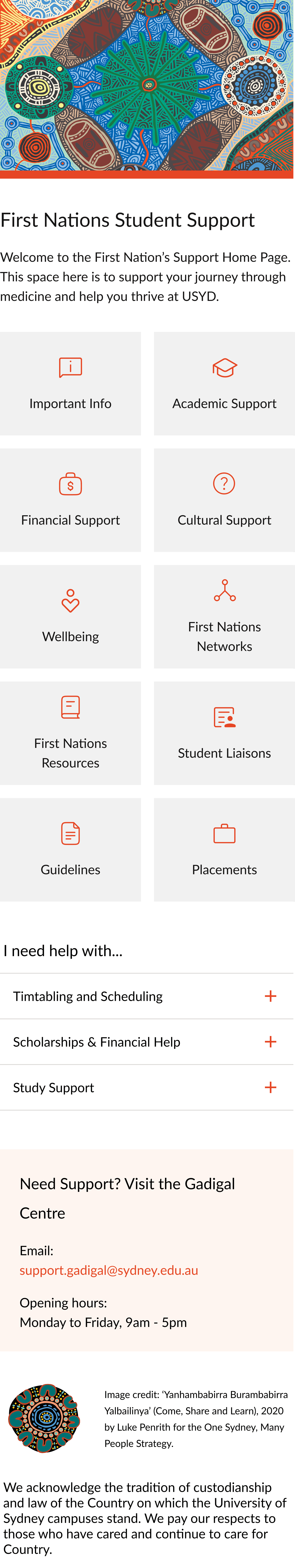 The final result is a functional, inclusive, and welcoming content hub designed to support First Nations students throughout their studies. It combines thoughtful UX design, adherence to University of Sydney branding, and a deep understanding of First Nations contexts to create a user-friendly experience that meets both student needs and project goals.