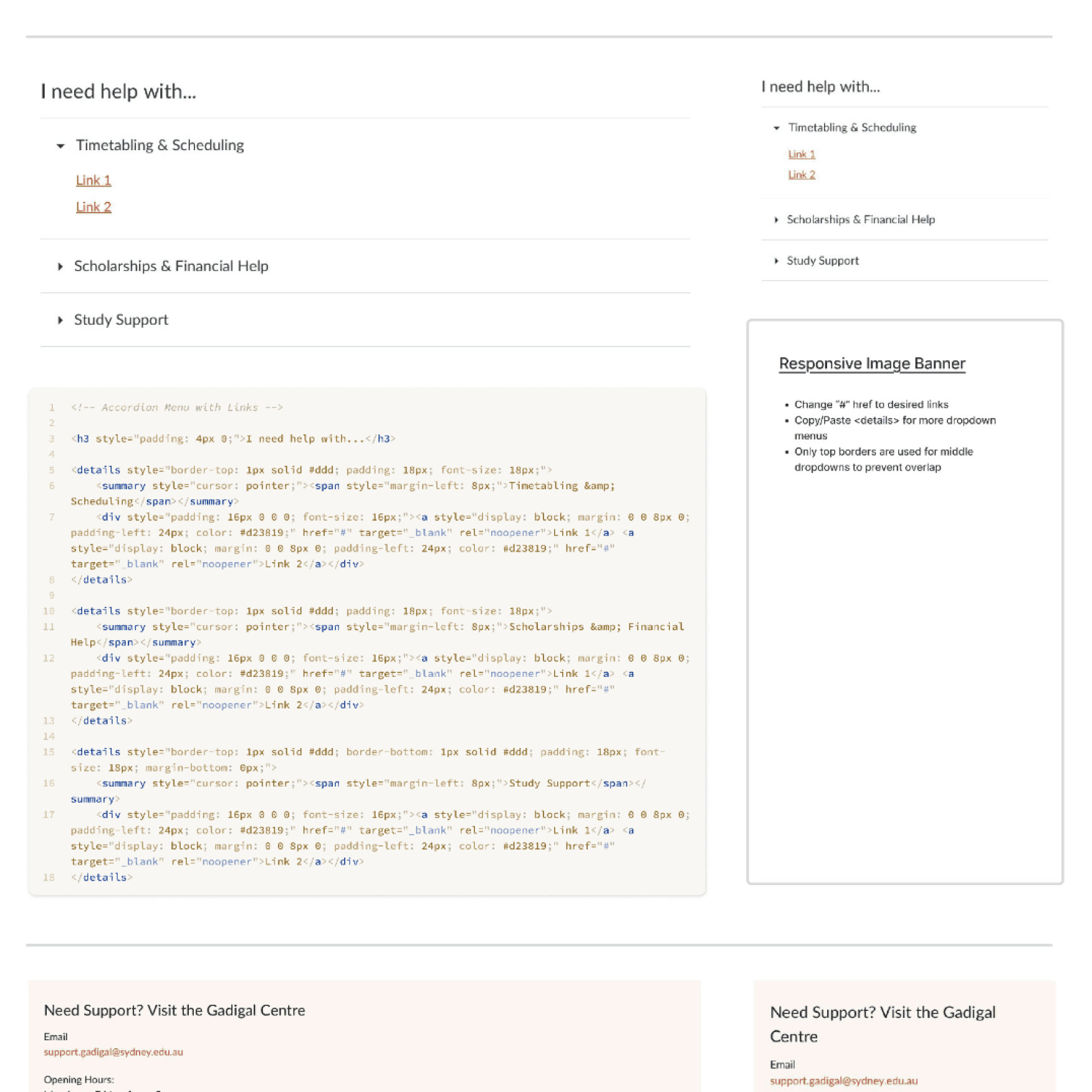 At this stage, a full high fidelity prototype was created for both mobile and desktop. Each section of the design was transformed into components, ready for development in Canvas. Personalised sections, such as ”I Need Help With…” and the ”Gadigal Centre”, were added to provide a more student focused approach, significantly enhancing the page’s usability and relevance.