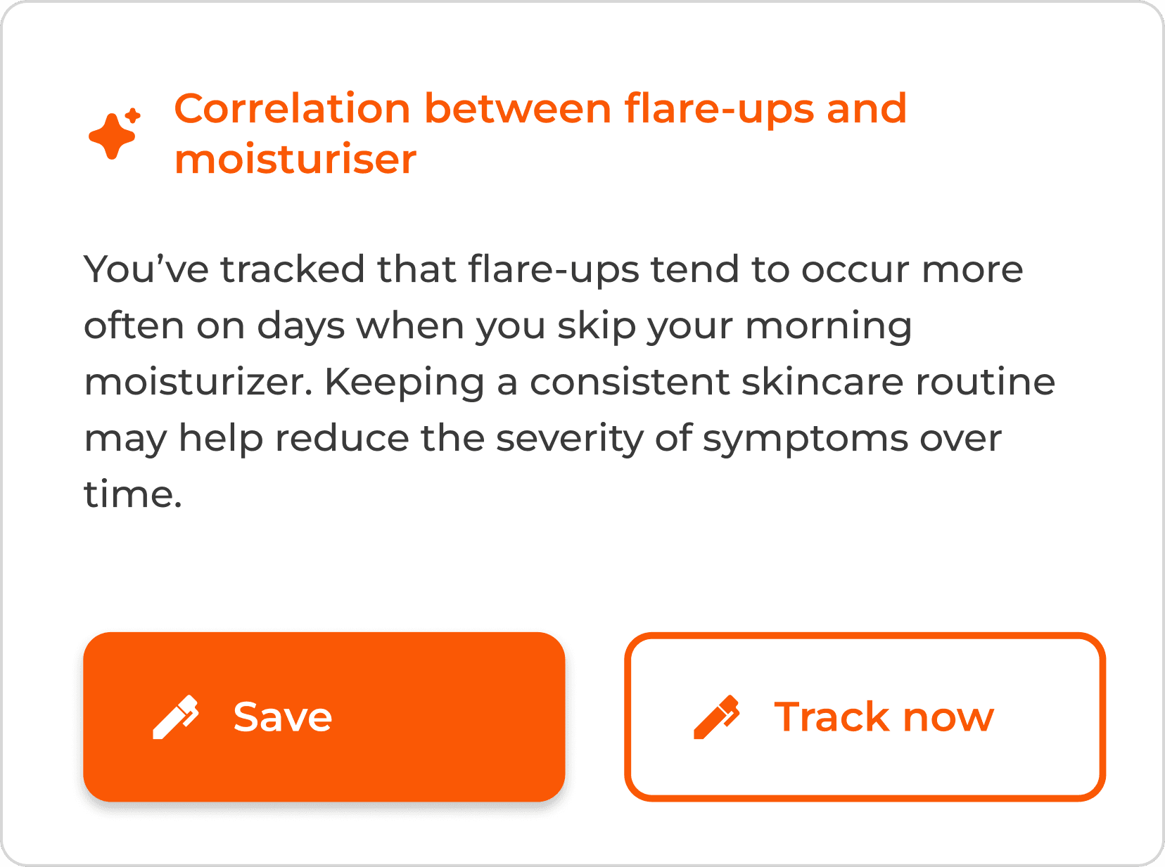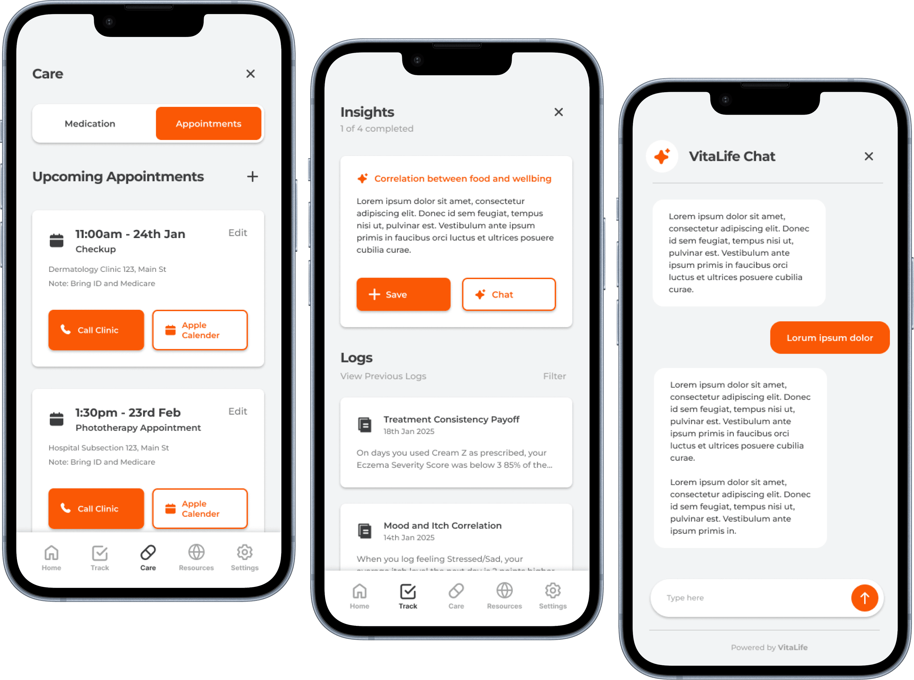 From the dashboard, the app is split into three core sections: Tack, Care and Insight. In the Track section, users can monitor any condition related factors they choose. The Care section provides health management tools, including upcoming appointments and medication schedules. In the Insight section, users are guided to uncover meaningful patterns and generate actionable insights based on correlations within their tracked data.